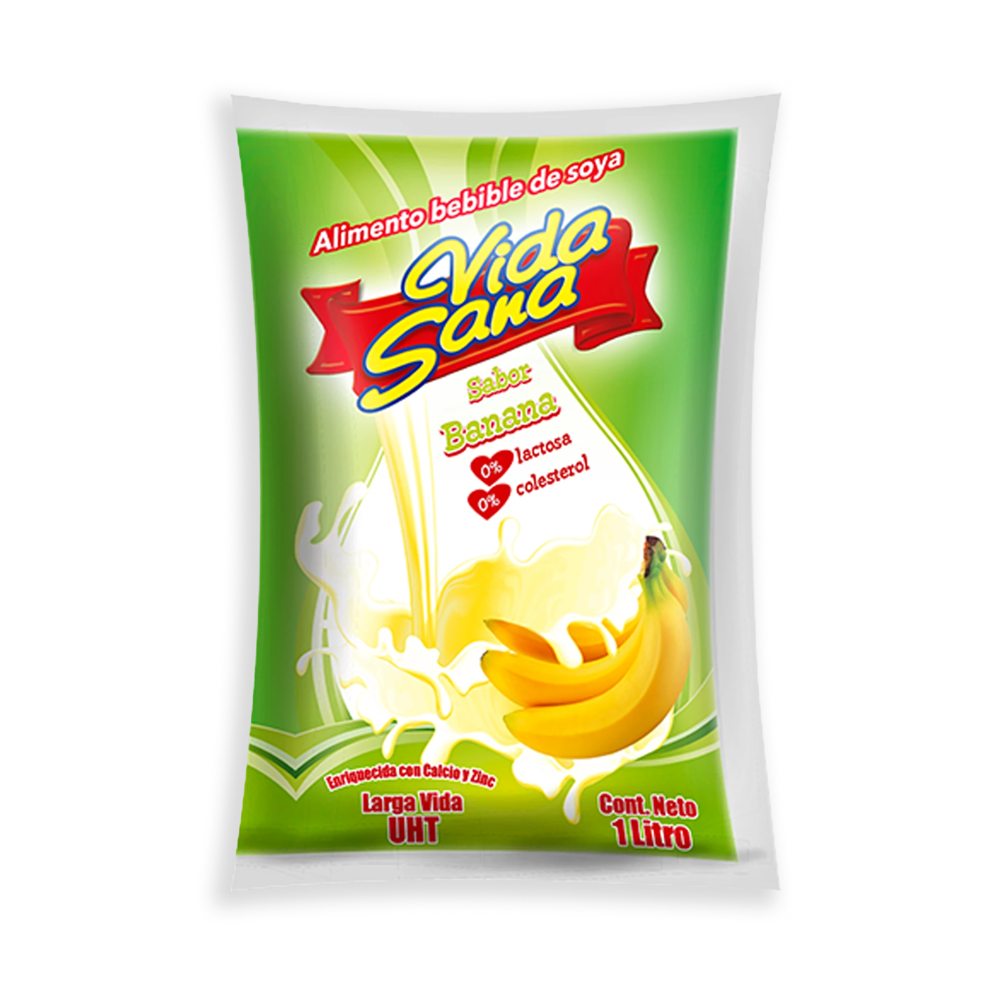 Extracto acuoso de soya sabor banana, ultrapasteurizado, fuente de hierro fortificado con calcio, fósforo y zinc 0% colesterol y 0% lactosa.