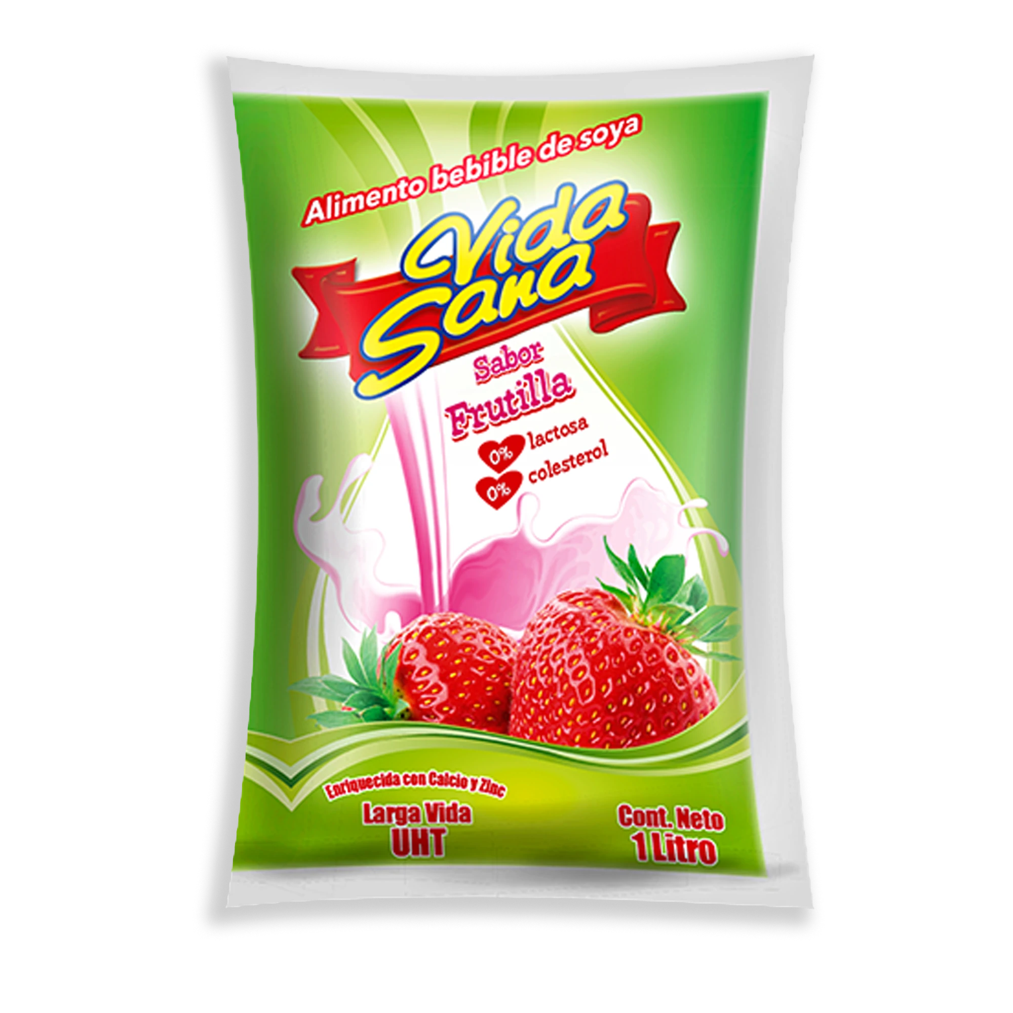 Extracto acuoso de soya sabor frutilla, ultrapasteurizado, fuente de hierro fortificado con calcio, fósforo y zinc 0% colesterol y 0% lactosa.